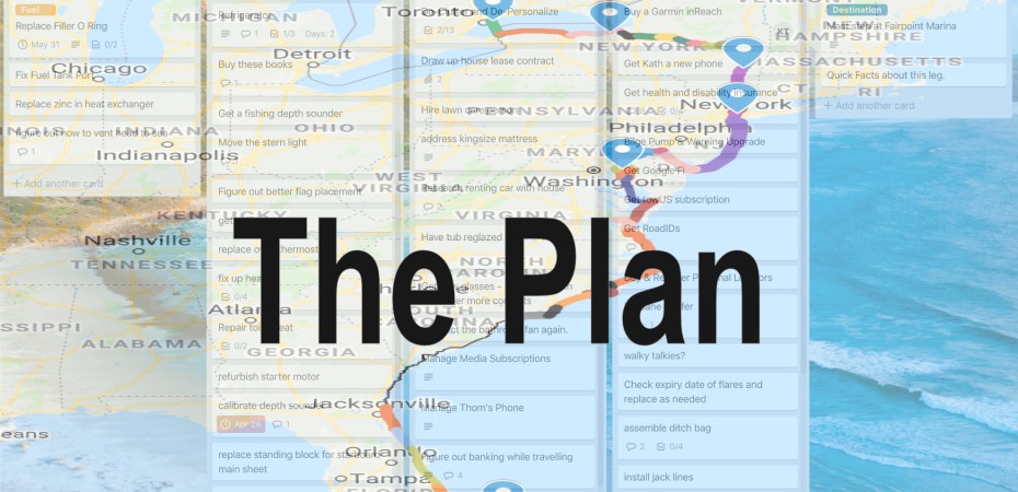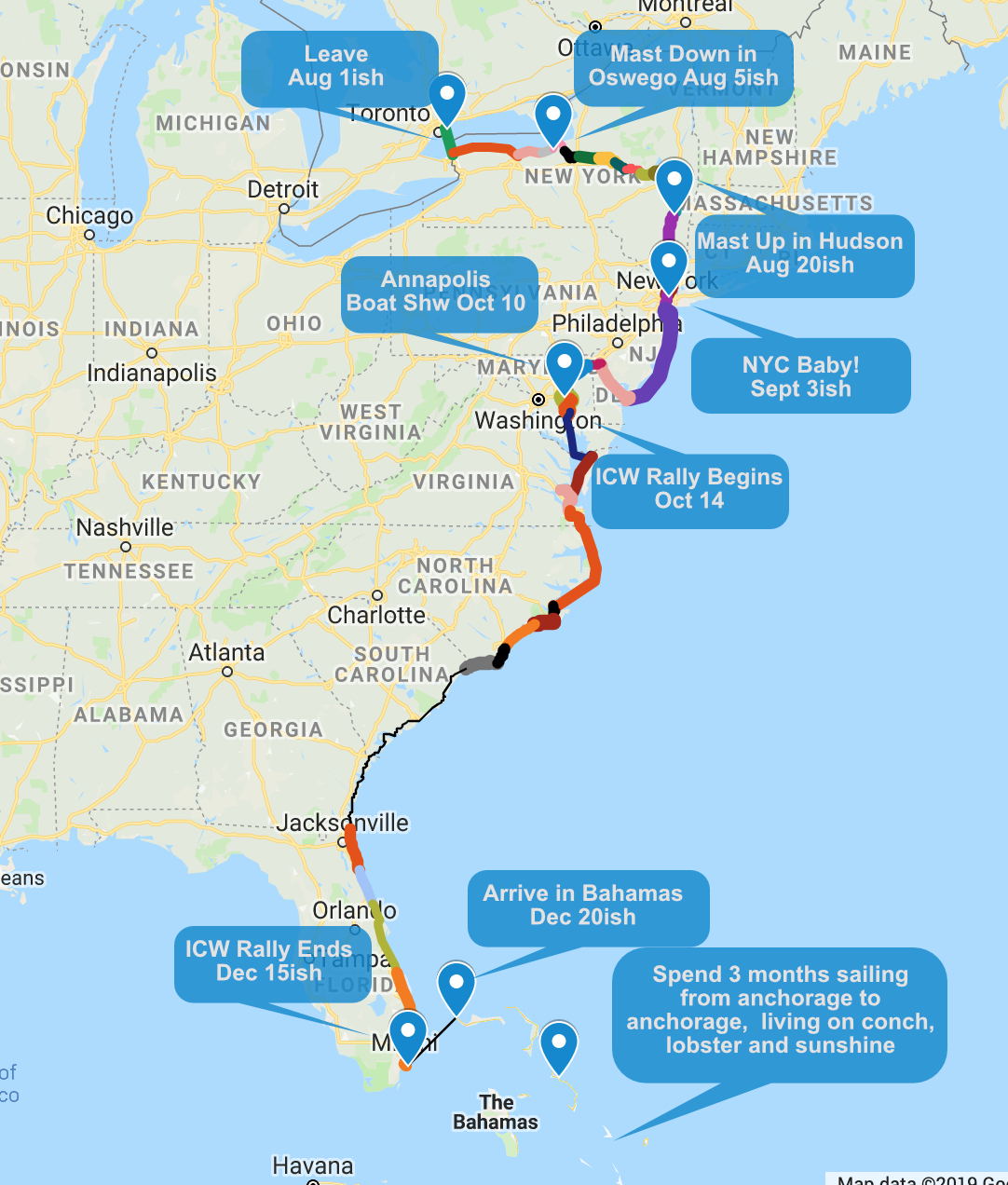 Our plan is simple: quit our jobs, ready the boat, delete lots of stuff like cars, furniture, etc, rent the house, figure out and subscribe to American health insurance, phones & banks, quit the choirs, the curling, the book clubs that we love, give our loved ones a big kiss, and then slip the lines. Head south, in August, before the cold arrives. Spend the winter in the Bahamas. Then figure out what’s next.