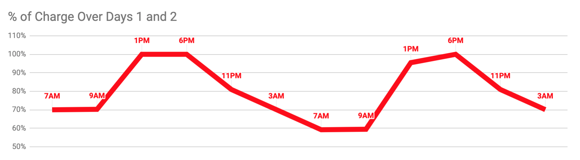 Coincidentally. we estimate that, at worst, our boat will consume 192 amp hours of power per day. But, during the day, the sun is up and generating electricity for us. So the batteries will reach full charge during the day and only draw down throughout the night. According to my calculations, 2 days of sailing in relatively sunny days should look something like this, assuming that we start day one at 70% charge: