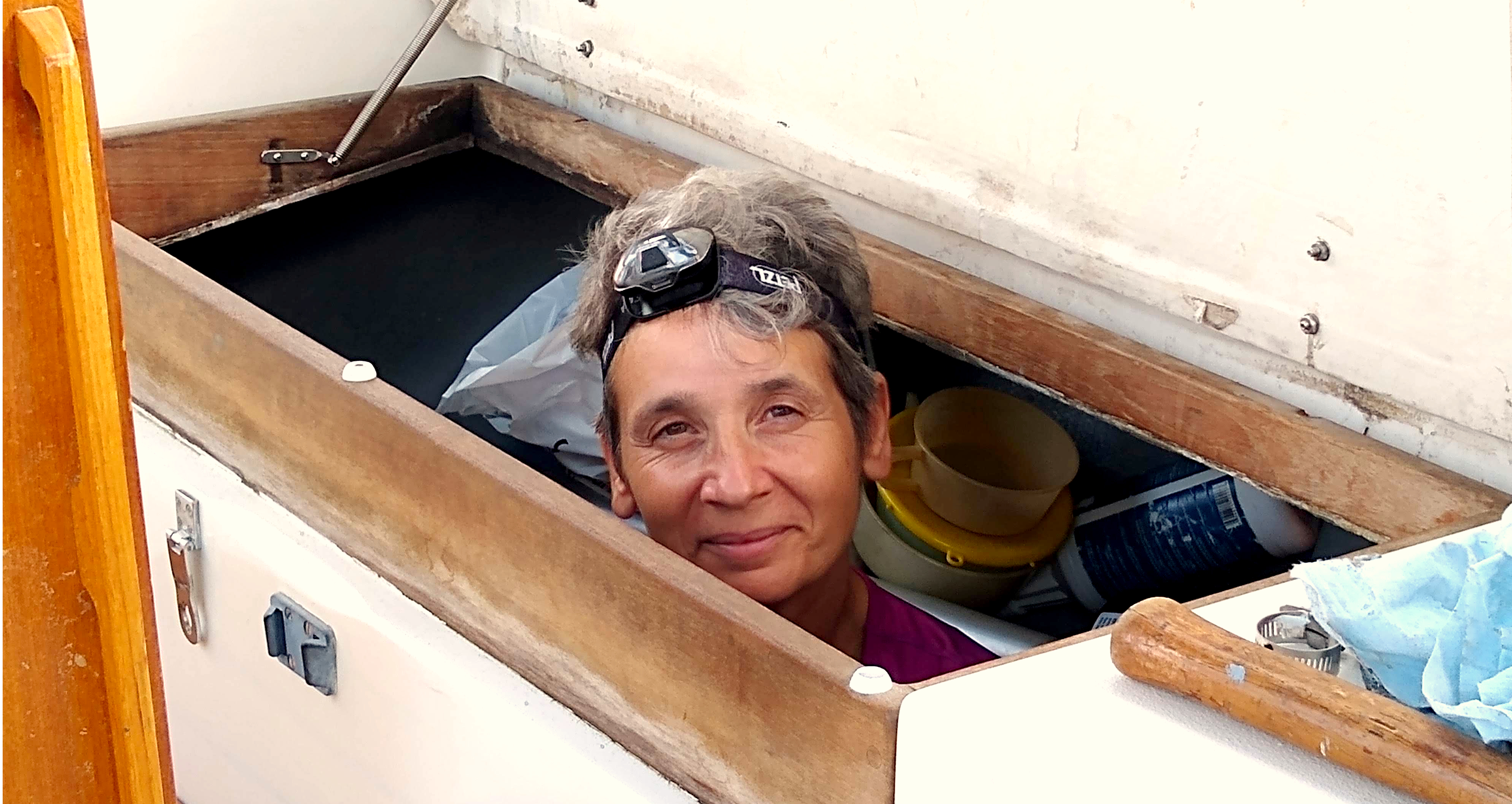 Our boat is ready for sailing again, and the lockers we emptied to access the nether regions are repacked with spare anchors, lines, etc.