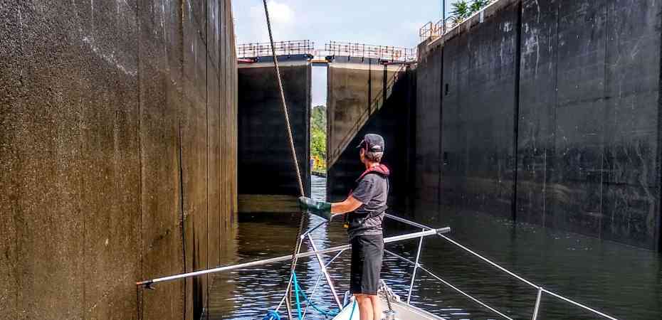 You find yourself at the bottom of a square metal box, about 4 stories deep. There are several slimy ropes dangling down from the top. You are frantic to get one. You snag one with a hook and pass it back to your partner. You grab another for yourself. Since they are all that stops your boat from ricocheting around the lock like a billiard ball, you hang on to the slime for dear life. At the bow, I also use the boat hook to keep the boat away from the wall. That means I have stabbed desperately at the walls of 30 locks.