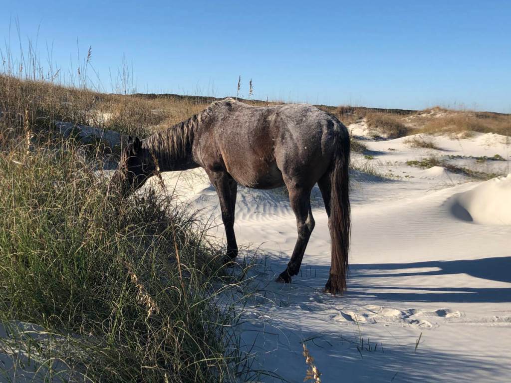 Cumberland Island has wild horses. I was expecting to watch herds running wild along the beach. Instead, these horses are quite low energy. They stand around and walk about along the paths, grazing as they go. They are quite used to humans and will follow you in hopes of food.